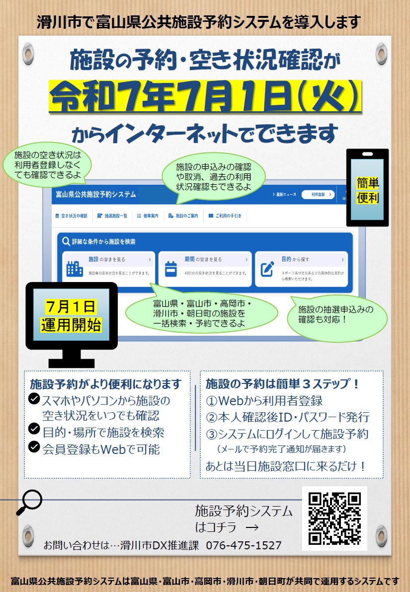 ▶施設の空き状況につきましては「富山県公共施設予約システム」からご確認をお願いいたします。